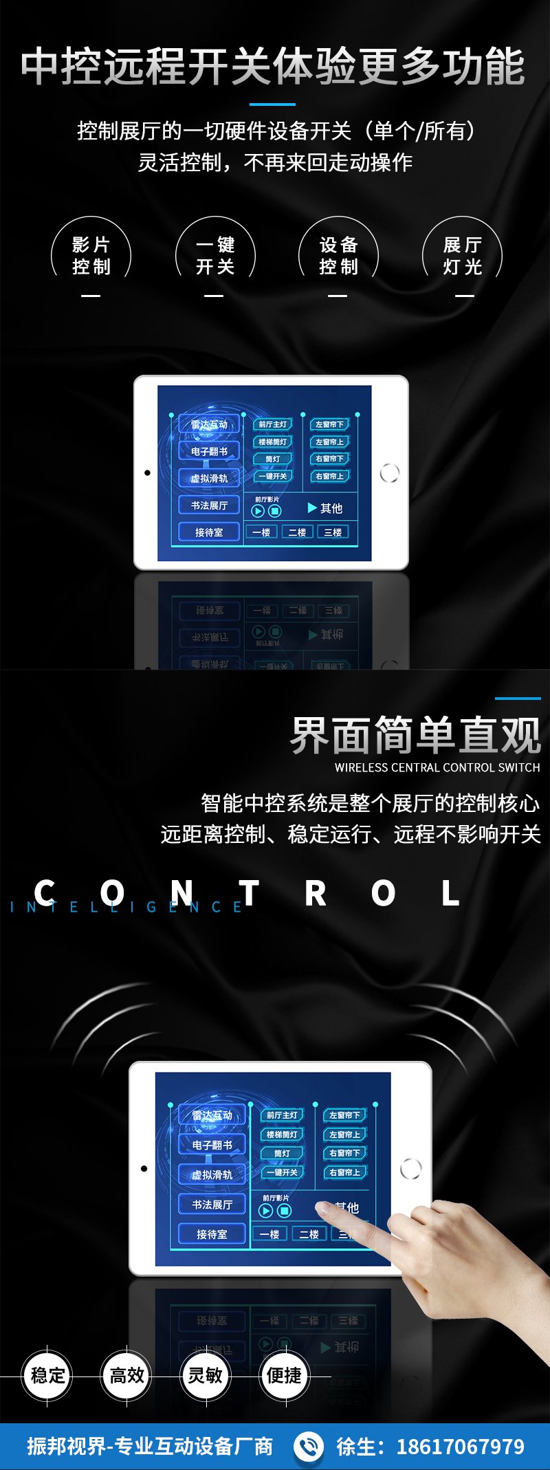 产品简介:智能中控是振邦视界新推出的一款可控制多媒体展厅设备的无线中控制系统。不仅能远距离控制展厅的一切设备开关、及对每个房间设备的控制。还可支持Appel和Android双项系统,操控界面简单、高效稳定、是展厅集中控制的好帮手。